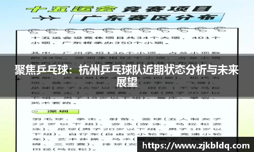 本文将对杭州乒乓球队近期的状态进行深入分析,并展望未来的发展。在整体竞技水平和团队协作上,杭州乒乓球队正面临着新的挑战与机遇。首先,将从球队近期比赛表现入手,分析其优缺点以及改进空间;其次,探讨教练团队的战术安排及其对球员发挥的影响;然后,分析运动员的个人状态,包括体能、心理素质等方面;最后,将展望...